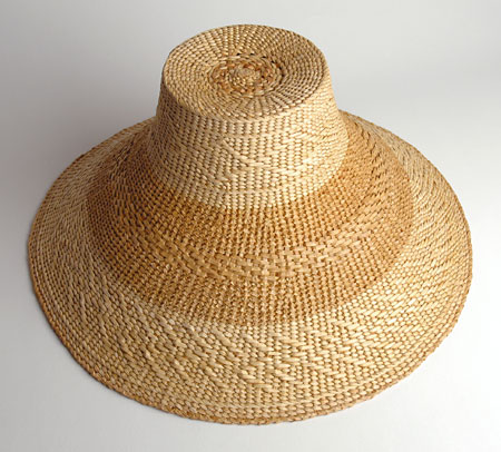 Solidweave hat of red and yellow cedar bark, with pattern.
